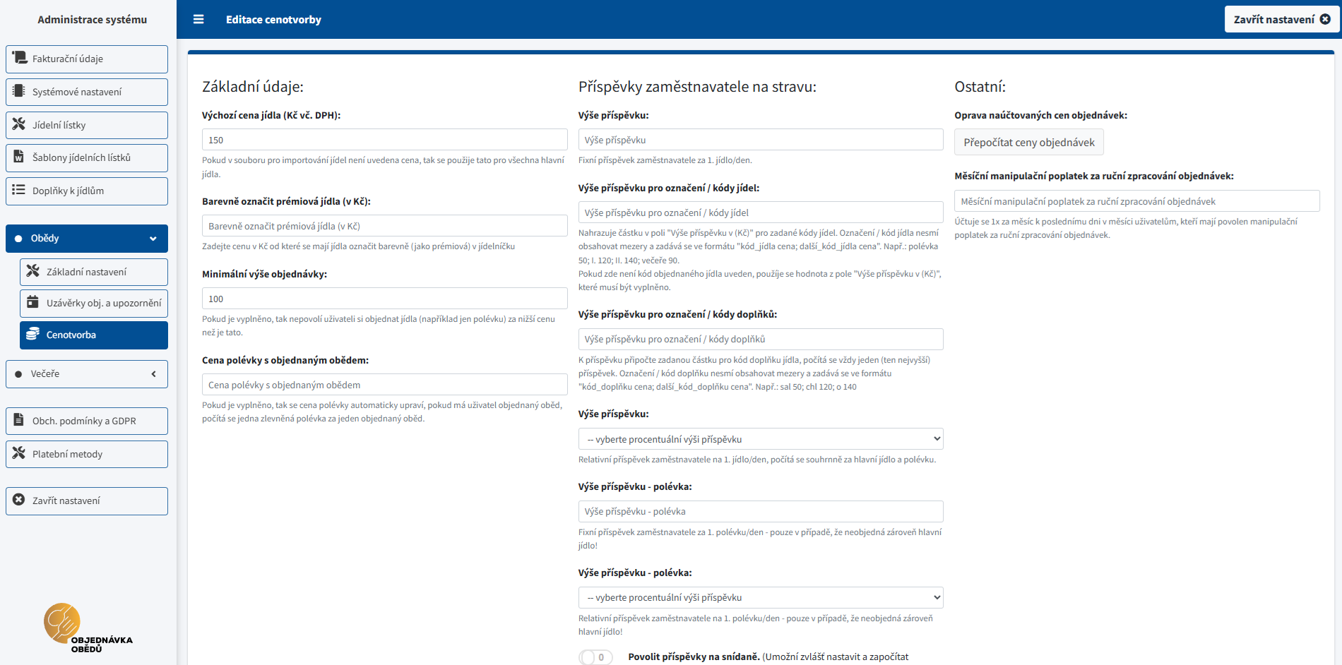 V této části nastavujete ceny a příspěvky pro konkrétní jídelní lístek. Týká se jak výchozích cen při importu jídelníčků, tak příspěvků zaměstnavatele a speciálních pravidel (např. minimální výše objednávky nebo zlevněná polévka k obědu).