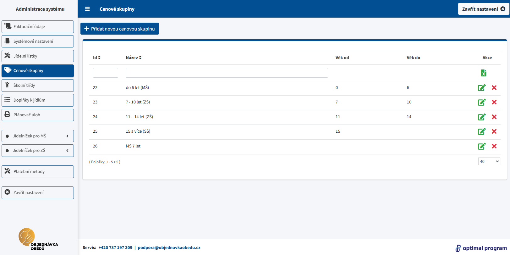 Věk do musí být větší nebo roven věku od. Systém rozsahy neblokuje ani nekontroluje jejich překrytí – je to záměr, protože systém může používat i dodavatel jídla a pro různé školy mít rozdílná pravidla cen. Proto je důležité si rozsahy nastavit tak, aby se nepřekrývaly.
