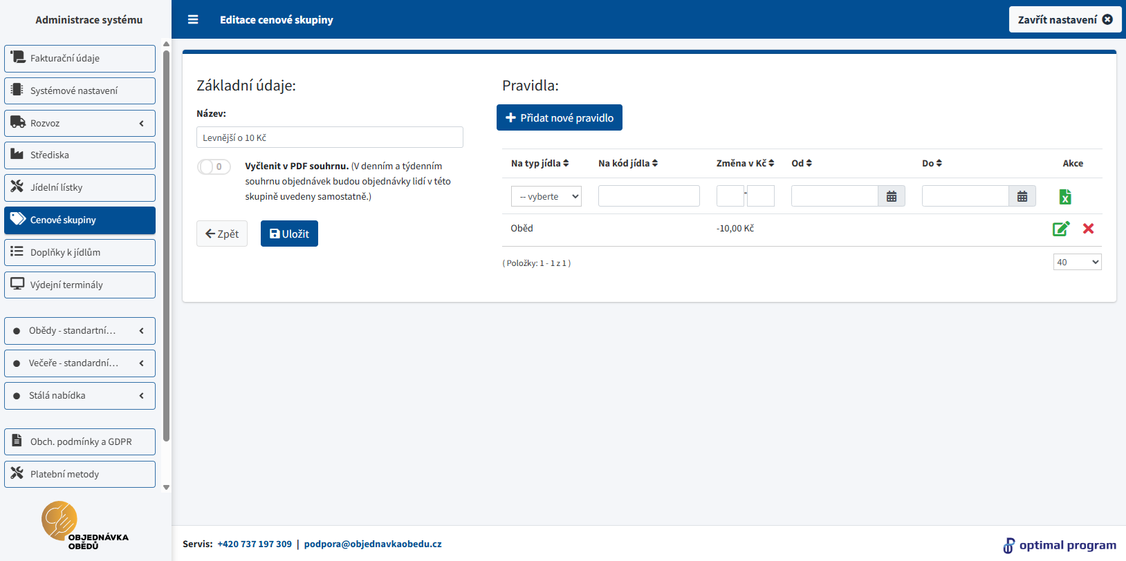 Po vytvoření cenové skupiny můžete definovat pravidla, která upravují cenu jídel. Pravidla se nastavují přímo v detailu cenové skupiny a platí pouze pro tuto skupinu.