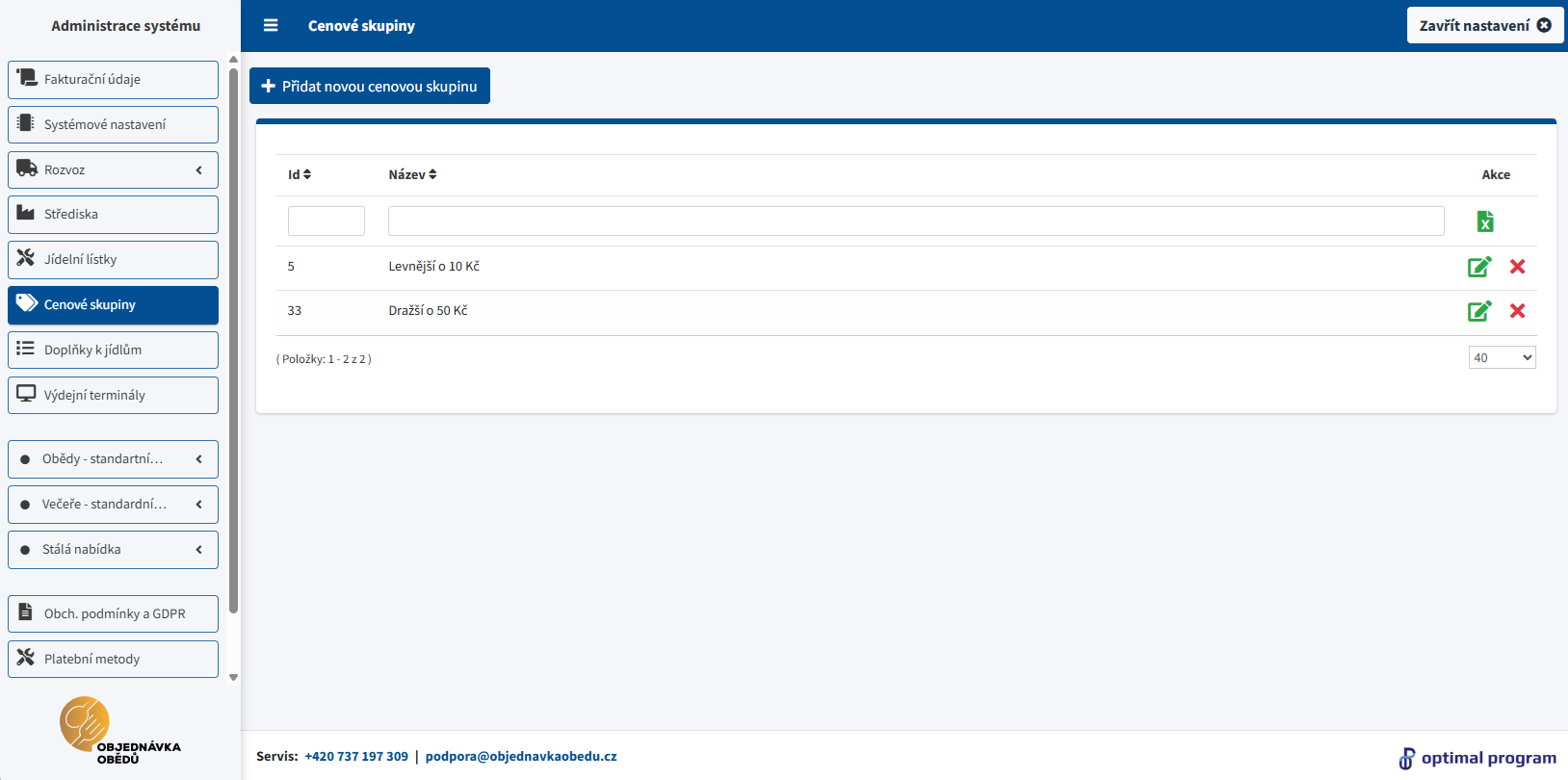 Cenové skupiny slouží k tomu, aby různí strávníci měli odlišné ceny za stejná jídla. Sekce se zobrazí pouze tehdy, pokud je v systémovém nastavení zapnutá volba Zapnout cenové skupiny.