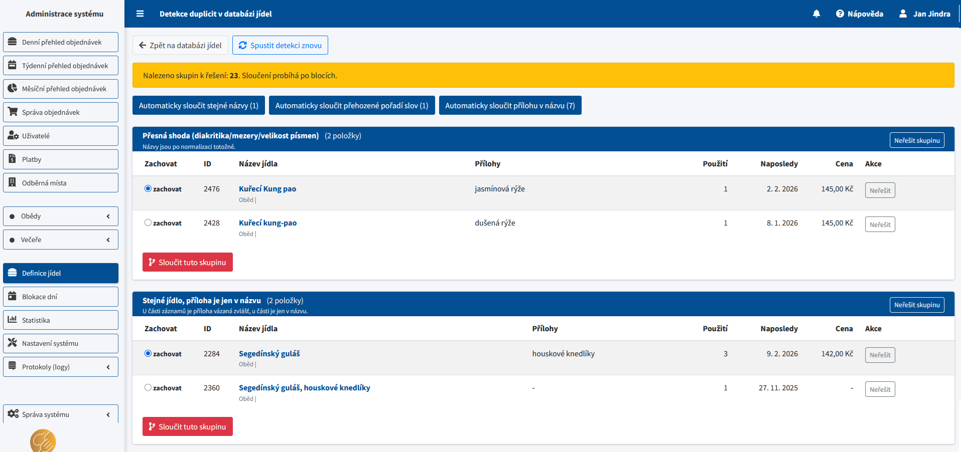 Stránka Detekce duplicit je dostupná v sekci Definice jídel. Systém automaticky prohledá databázi definic a najde záznamy, které jsou pravděpodobně stejné. Duplicity vznikají typicky při importech z různých zdrojů, ručním zakládání nebo při přechodu na automatickou synchronizaci.
