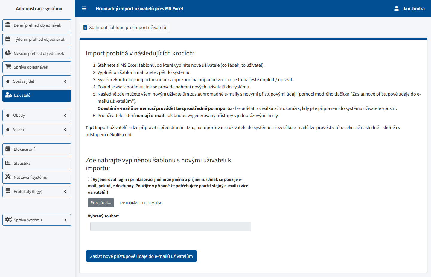 Nejprve si uživatele hromadně nahrajte, zkontrolujte a připravte. Až v den spuštění systému použijte tlačítko pro rozeslání přístupových údajů, aby uživatelé dostali login a heslo ve správný čas.