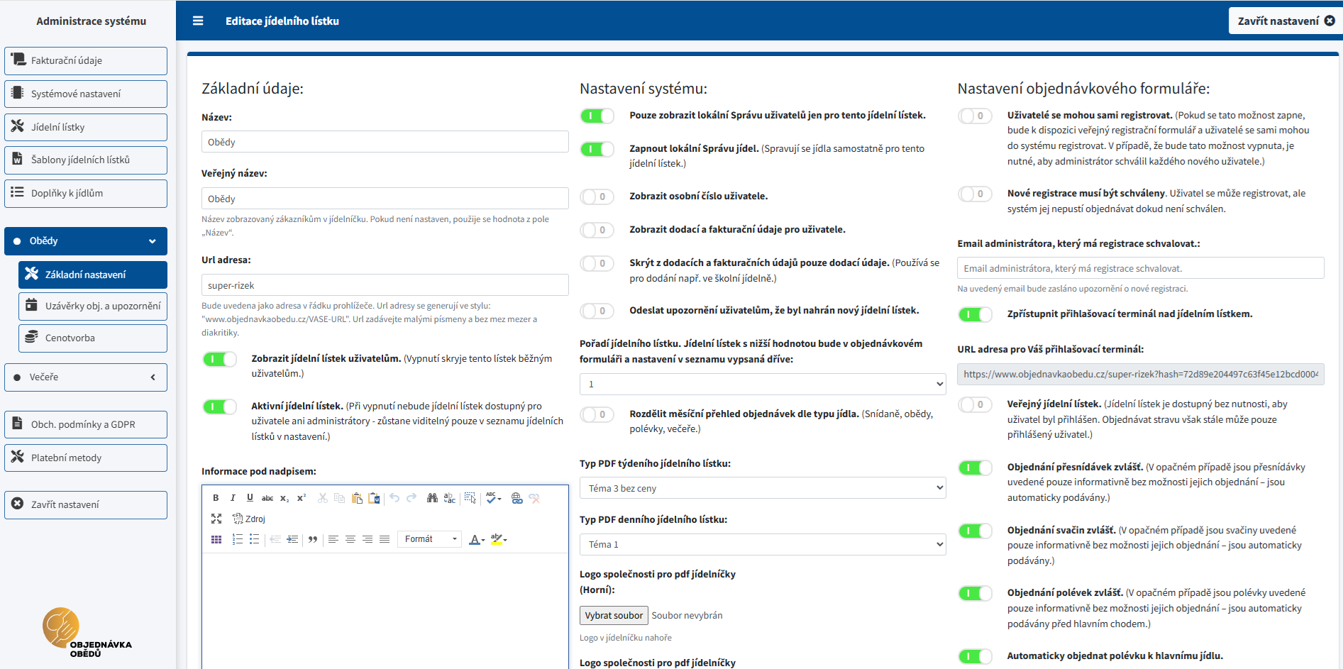 V této sekci spravujete jednotlivé jídelní lístky (provozy). Každý lístek má vlastní nastavení, které ovlivňuje objednávkový formulář, viditelnost, registrace, výstupy i chování uzávěrek. Pokud máte více provozů, každý se nastavuje zvlášť.