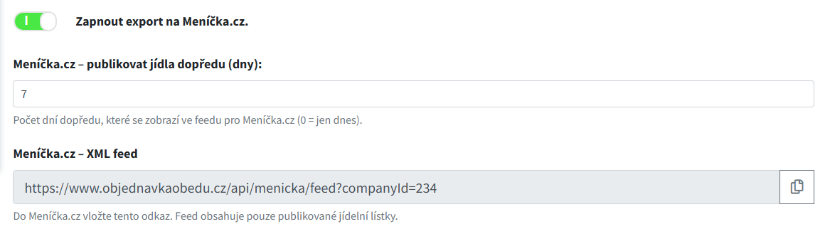 V této části zapnete export jídelníčků na Meníčka.cz a určíte, kolik dní dopředu se má do XML feedu publikovat (0 = pouze dnešní jídelníček).
