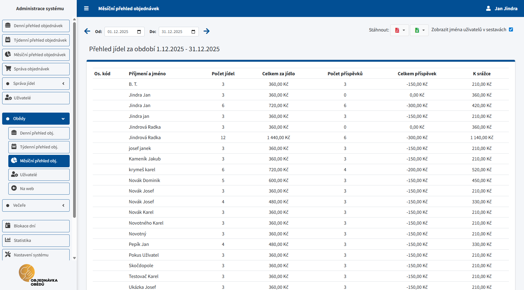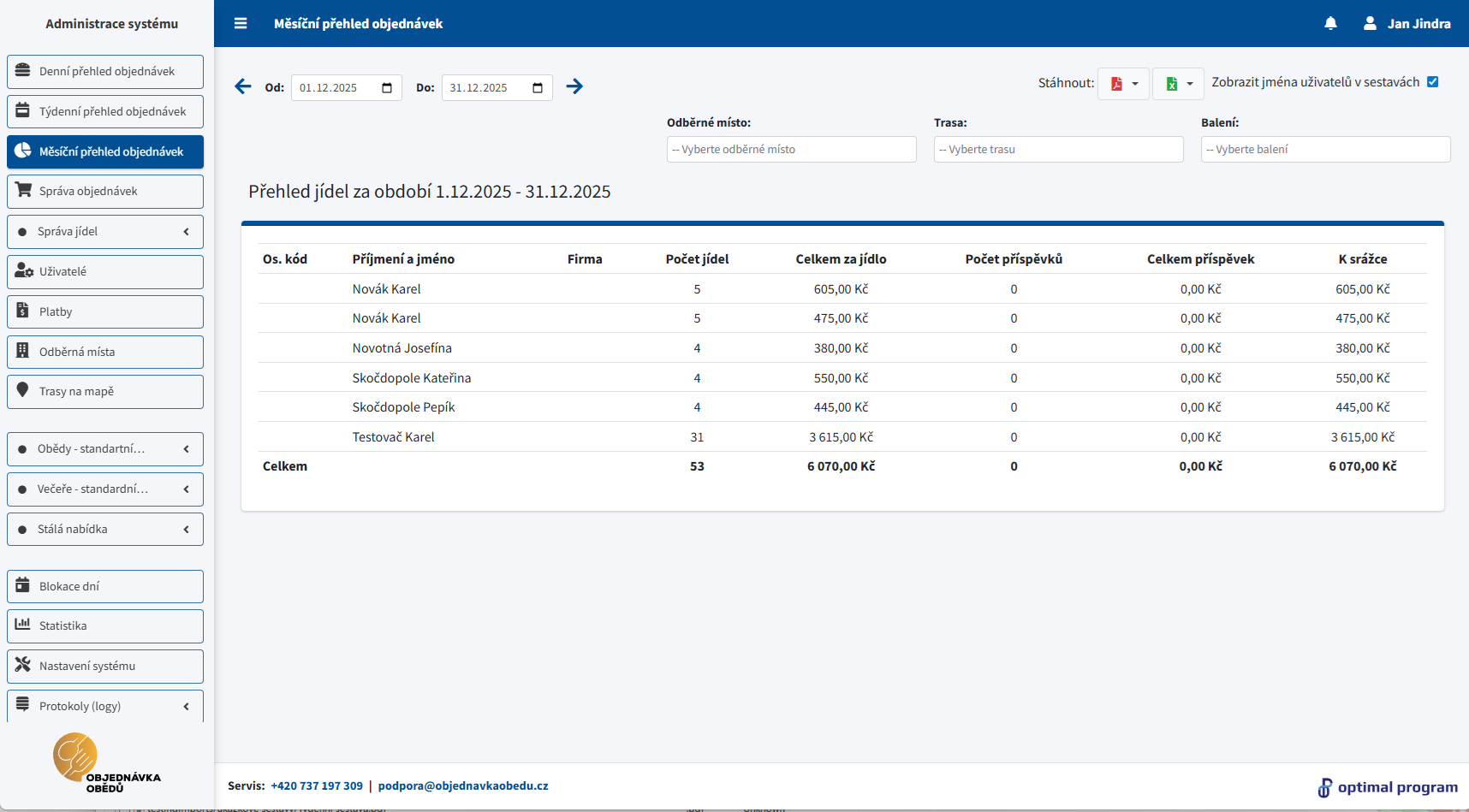 - Přehled objednávek dle uživatelů – detailní export po uživatelích.