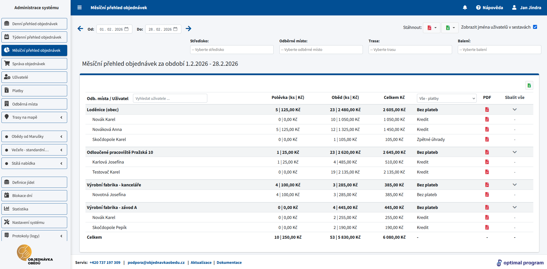 Pokud je aktivní modul Dodavatel jídla, přehled je strukturovaný podle odběrných míst. Uživatelé jsou seskupeni pod svá odběrná místa s mezisoučty za skupinu i celkovými součty. Díky tomu je na první pohled jasné, kolik objednávek a za kolik připadá na jednotlivá místa.