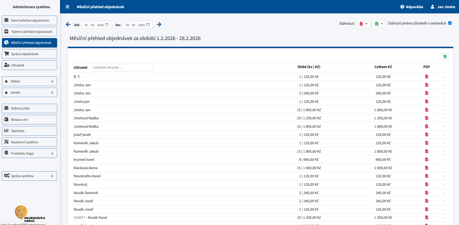 - Seznam bez objednávky (PDF) – uživatelé bez objednávek v daném období.