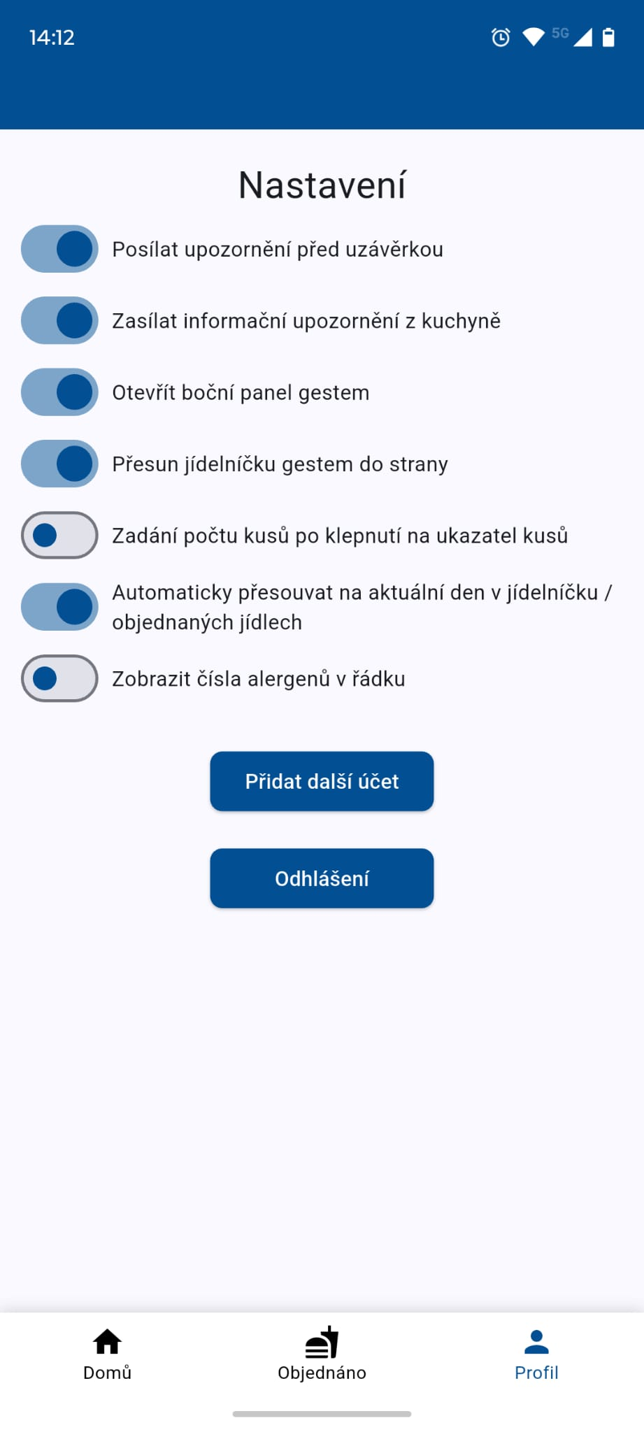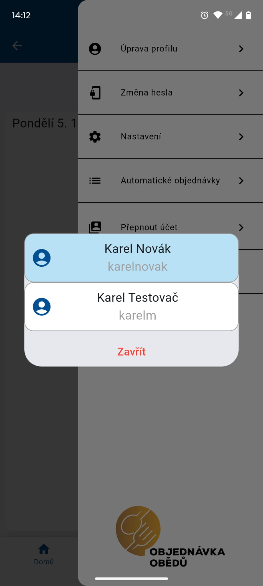 V jedné aplikaci může být přihlášeno více účtů současně. Hodí se to například ve školních provozech, kdy si jeden rodič přidá více dětí, nebo v situaci, kdy někdo objednává i za jiné (např. sekretářka má vedle svého účtu i účet „Návštěvy“).