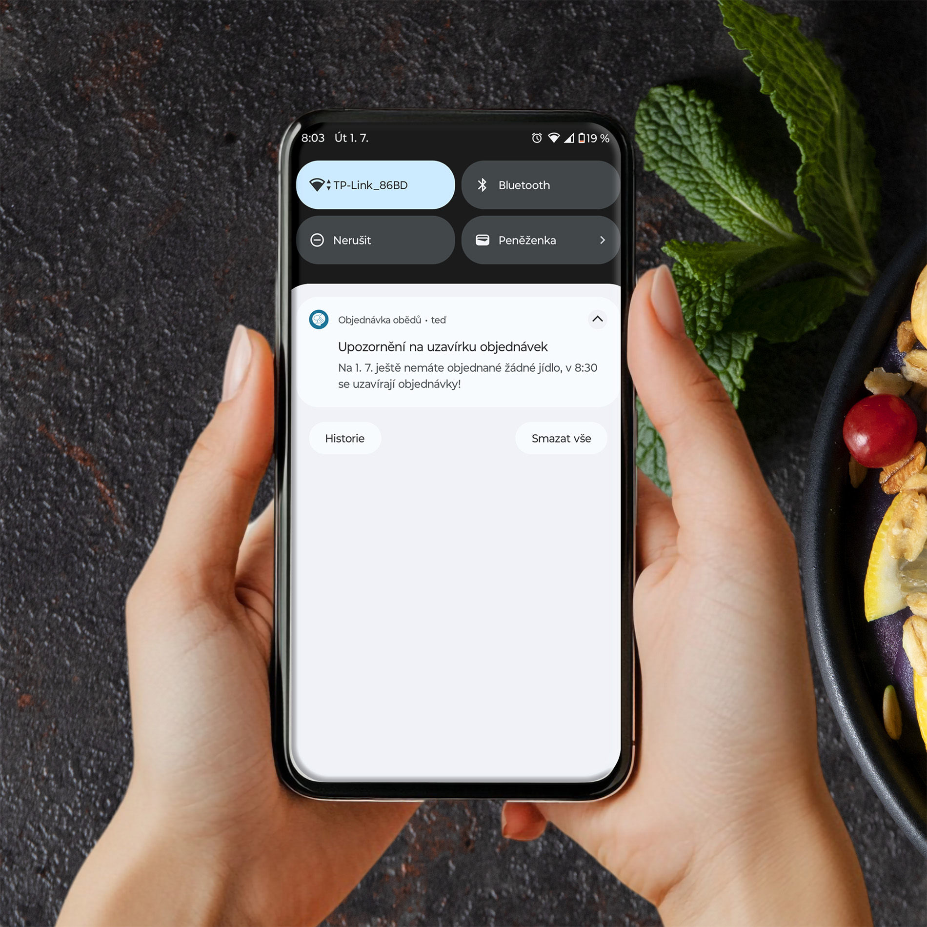 Uživatel si může v aplikaci zapnout notifikace a mobil ho včas upozorní, že se blíží uzávěrka objednávek. Typicky chodí upozornění přibližně 2 hodiny před uzávěrkou, aby měl uživatel dost času objednat.