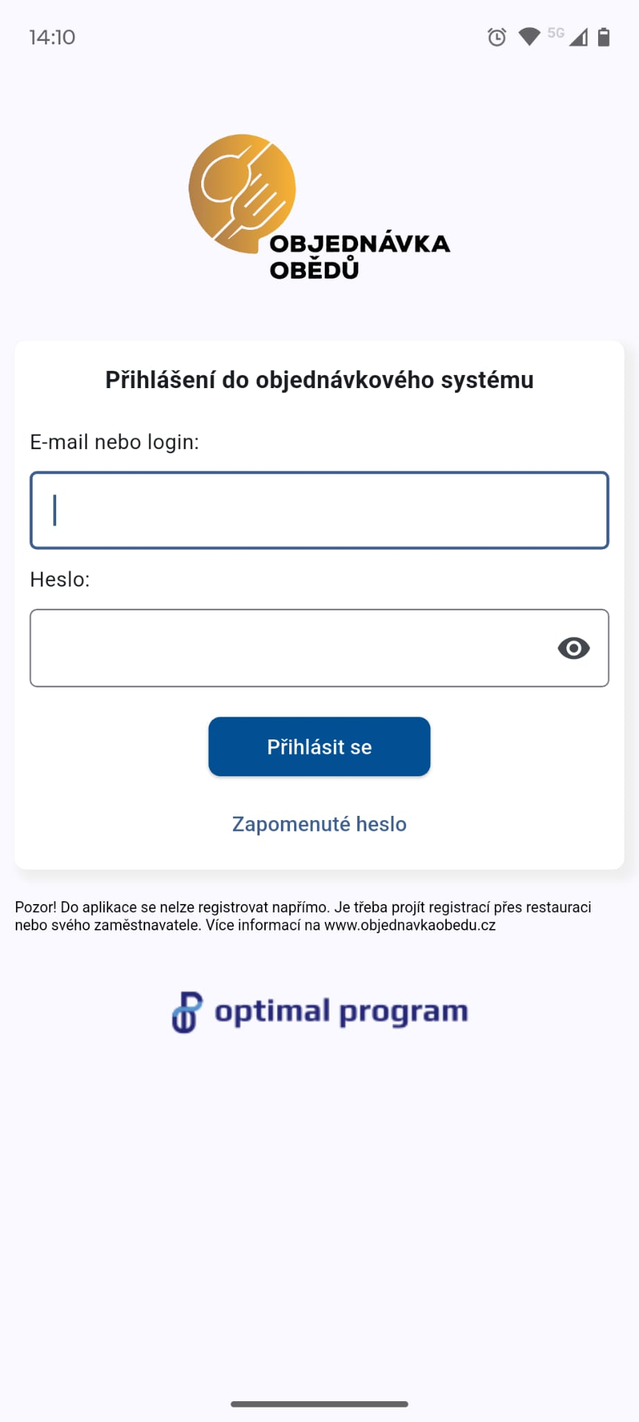 V aplikaci není dostupná registrace – tu je potřeba udělat přes web (viz Registrace).