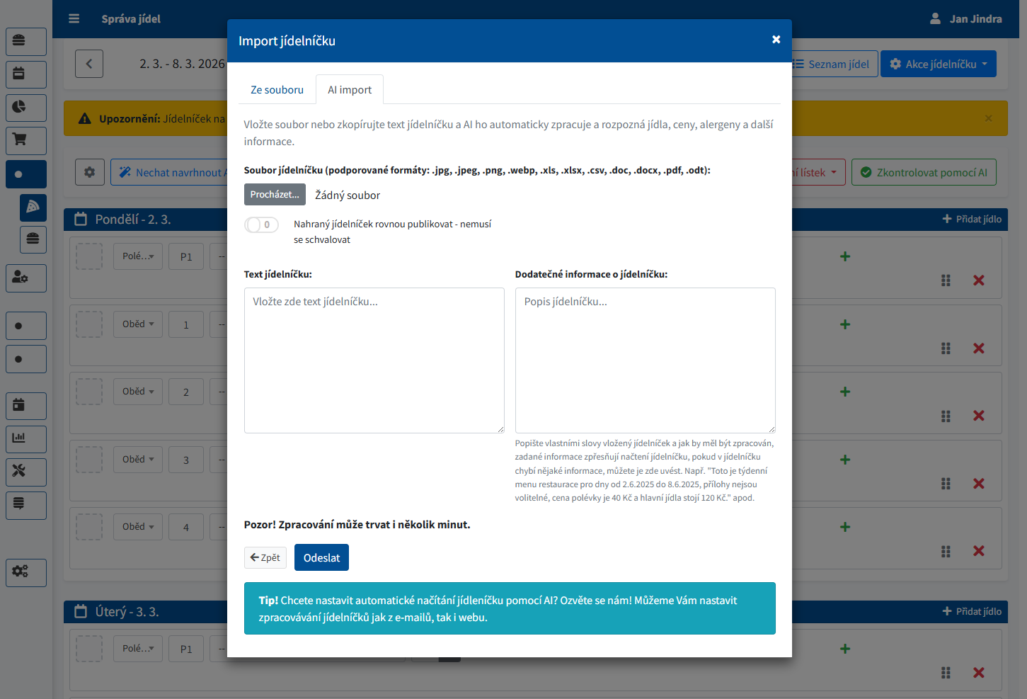 - Správa jídel → Správa jídelníčku → Import → záložka AI Import – otevře formulář pro ruční AI nahrání i historii importů.