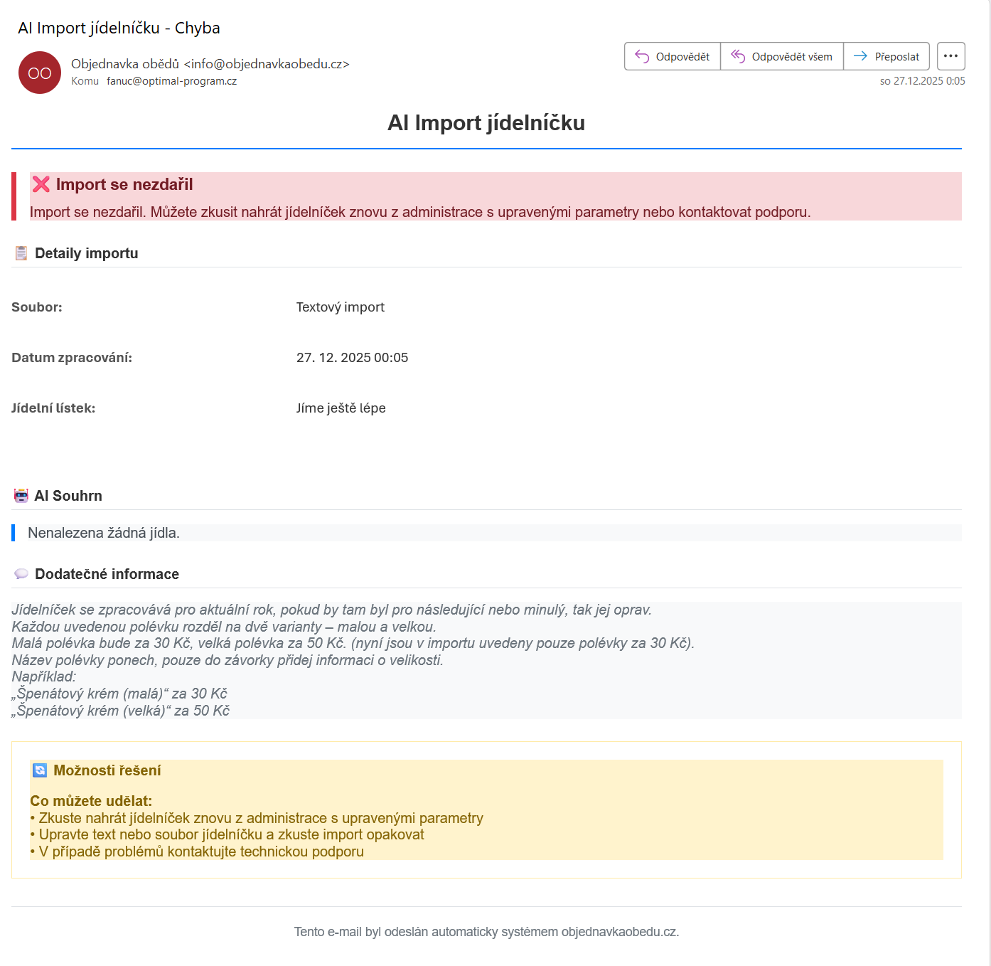 Po automatickém AI importu chodí e‑maily o úspěchu i chybě uživatelům, kteří mají oprávnění Schvalují jídelní lístek (viz Oprávnění administrátora).