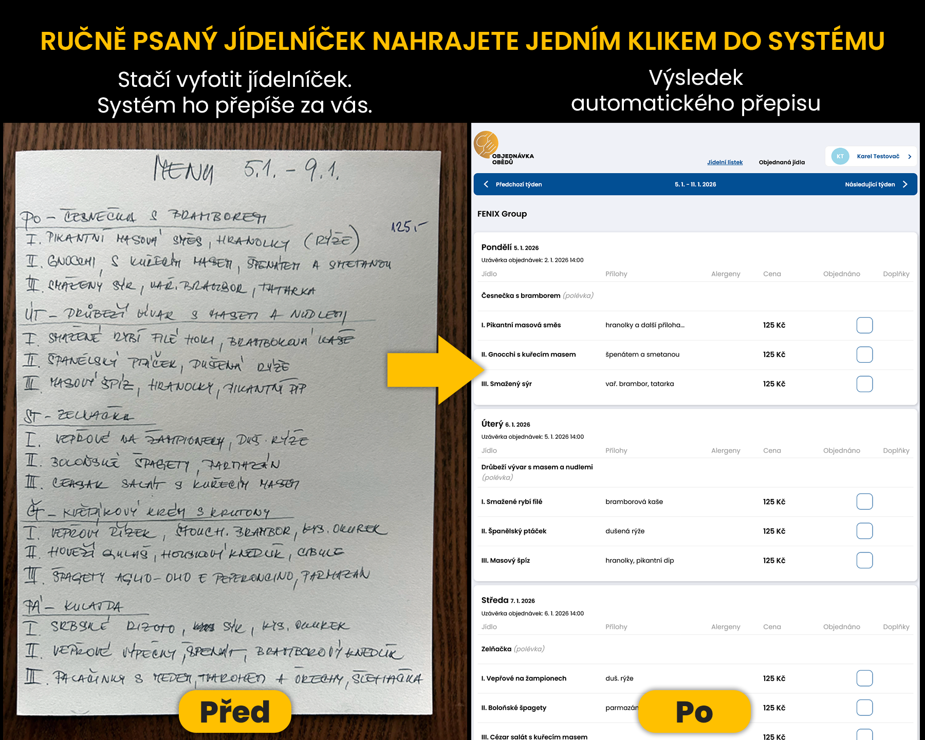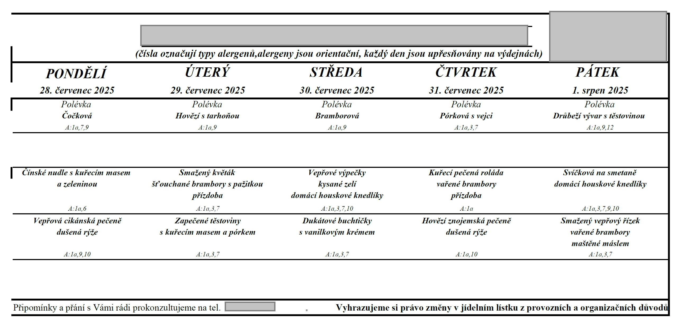 - Jídelníček je na webu – systém ho automaticky převezme po změně.