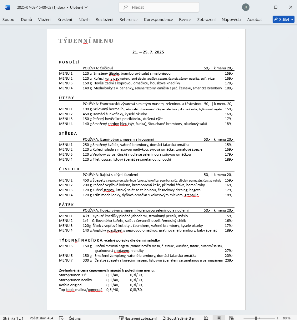 - Ceny – pokud nejsou uvedené, u hlavních jídel se použije výchozí cena z nastavení firmy; u polévek zůstane cena prázdná. Ceny lze doplnit i přes „Dodatečné informace“, pokud je v podkladu nemáte.