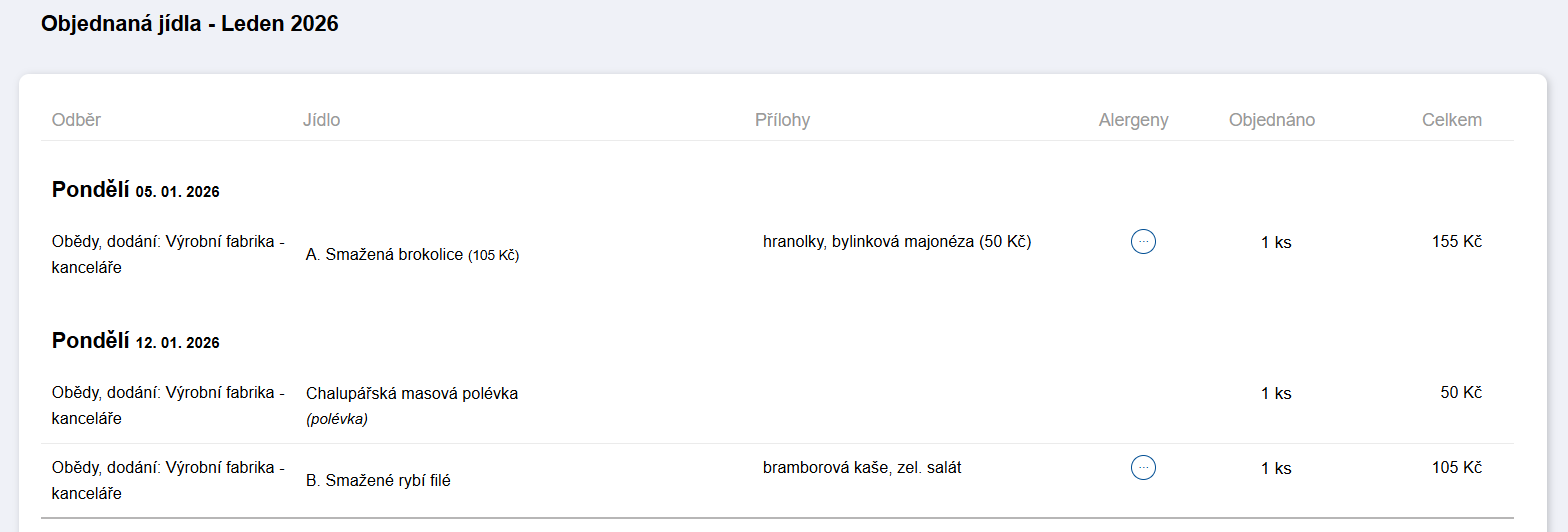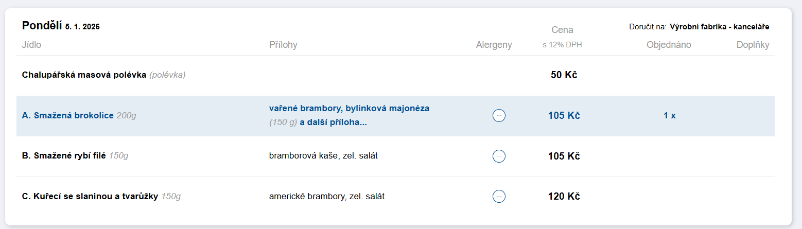 Pokud už pro daný den nelze objednávat (po uzávěrce), zobrazí se pouze aktuální odběrné místo jako statický text. Uživatel vidí, kam budou jídla doručena, ale nemůže to změnit – změna by ovlivnila logistiku rozvozu.
