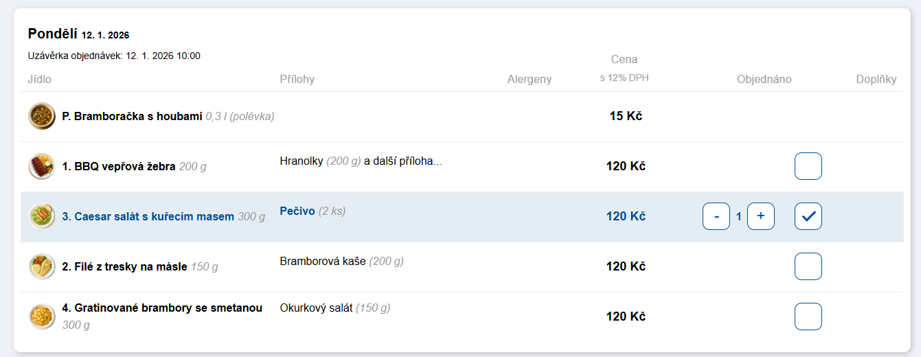 Pokud nechcete, aby si uživatelé polévku vůbec objednávali, můžete objednávání polévek vypnout a v jídelníčku ji uvádět pouze informativně. Polévka pak „automaticky patří“ ke každému hlavnímu jídlu a uživatel nic nevybírá ani neřeší zvýhodněnou cenu.