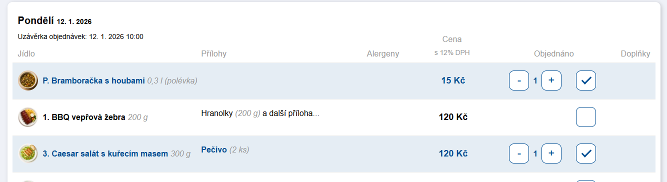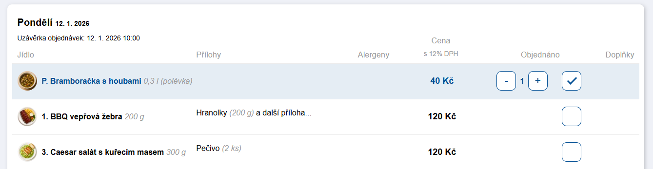 - při objednání hlavního jídla se přidá první dostupná polévka pro daný den,