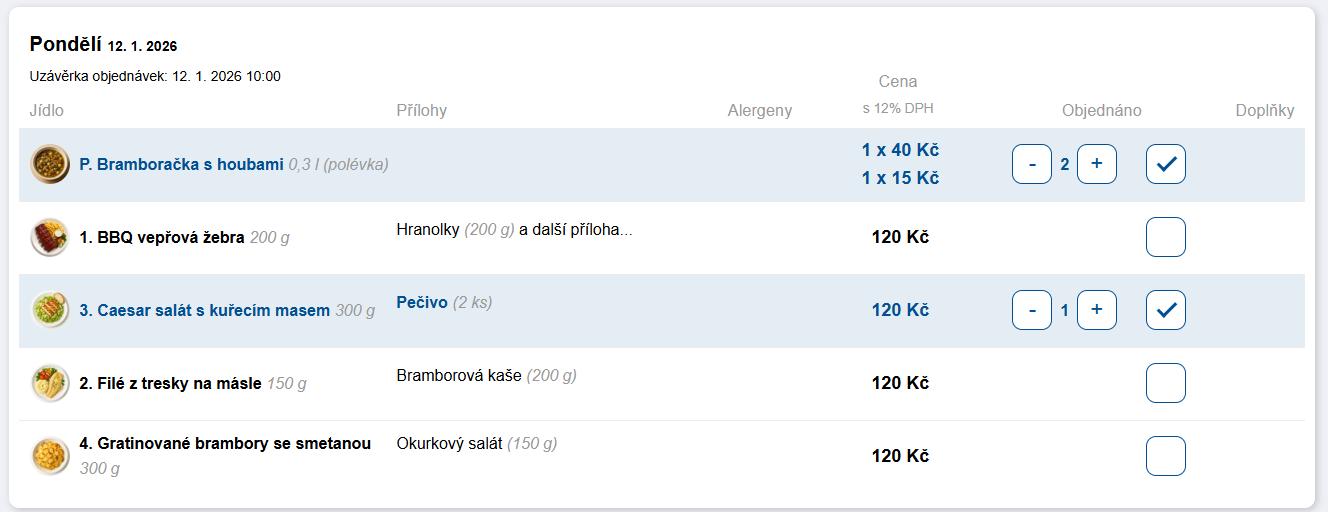 - počet polévek odpovídá počtu objednaných hlavních jídel,