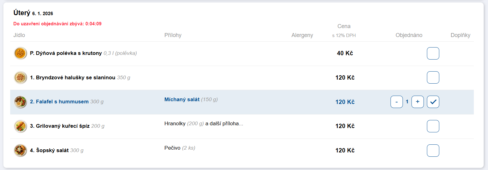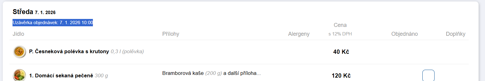 Čas uzávěrky se v objednávkovém formuláři zobrazuje u každého dne, takže uživatelé vždy vidí, do kdy mohou objednávat.
