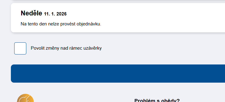 - pokud je povolena druhá uzávěrka, může uživatel stále provádět změny pomocí přepínače „Povolit změny nad rámec uzávěrky", který je pod jídelníčkem.