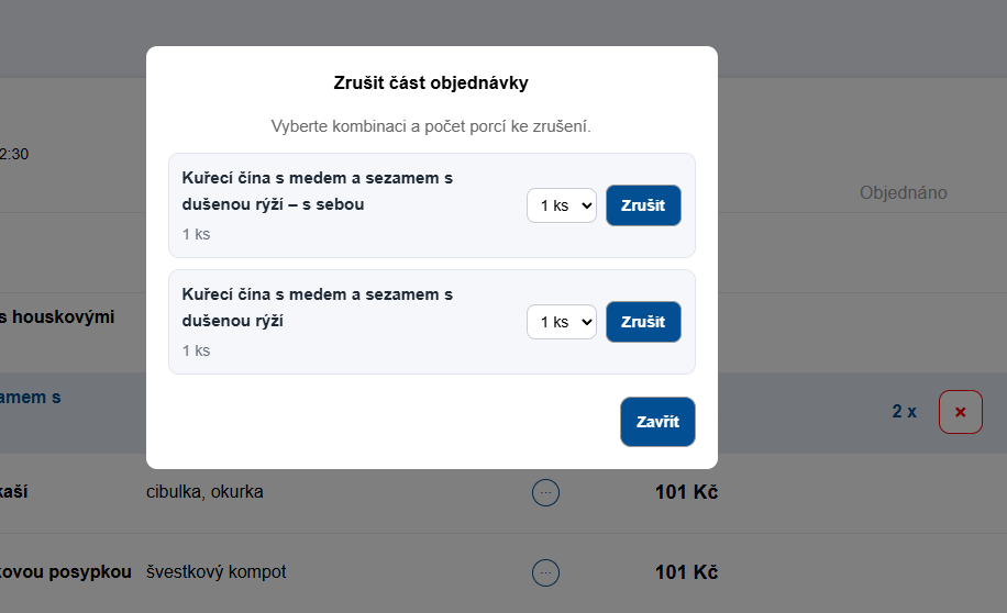 Po kliknutí na zrušení se otevře modální okno s konkrétními variantami jídla (kombinace příloh/doplňků) a uživatel vybere, kolik porcí chce odebrat. Zrušení se projeví ihned a zbytek objednávky zůstane zachovaný.