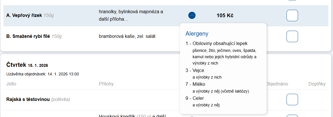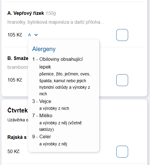- Desktop verze – tlačítko „..." které po kliknutí zobrazí tooltip s alergeny.