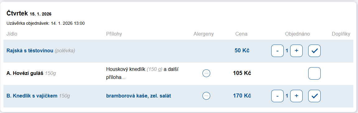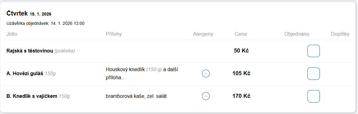 - Objednáno – zobrazuje se pouze přihlášeným uživatelům a obsahuje zaškrtávací políčko pro objednání jídla.