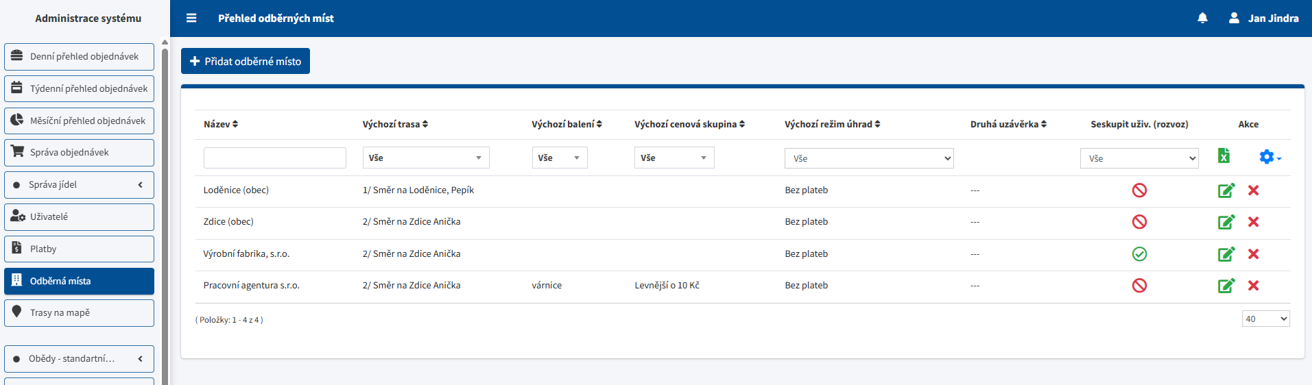 Sekce je dostupná pouze pokud je zapnut rozvoz a správa odběrných míst. Nejčastěji se aktivuje v rámci modulu Dodavatel jídla.