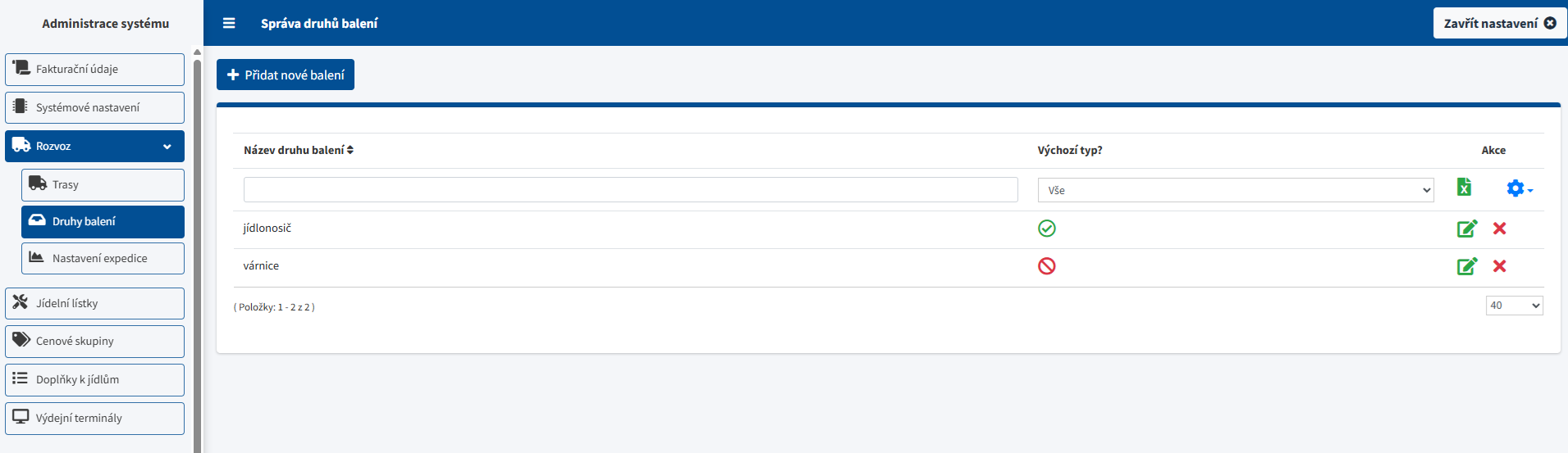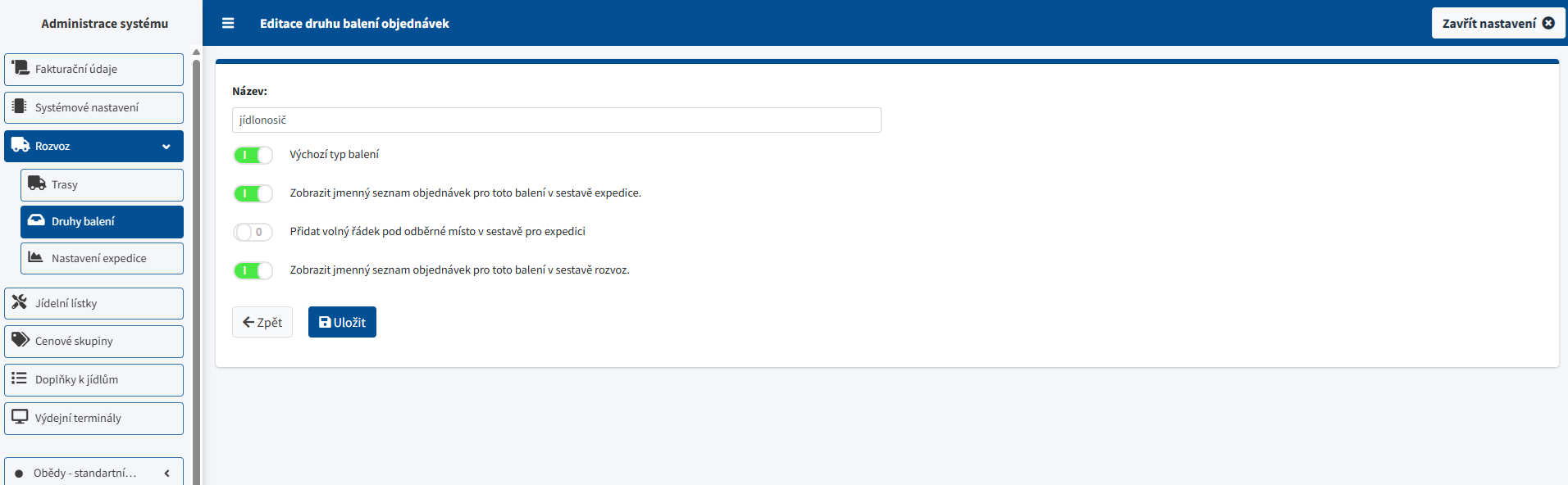 Druhy balení definují typ obalu, ve kterém se jídlo vydává nebo rozváží. Balení se používá v expedičních a rozvozových PDF a může být předvyplněné u odběrných míst či u uživatelů v nastavení rozvozu.