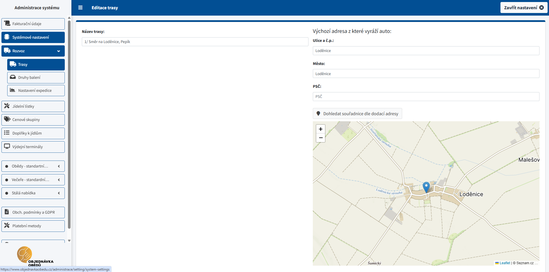Sekce Rozvoz je dostupná pouze, pokud máte v systémovém nastavení zapnutý rozvoz (typicky v modulu Dodavatel jídla). Menu Rozvoz je rozdělené do podsekcí Trasy, Druhy balení, Nastavení expedice a (volitelně) Volné dny. Dostupnost jednotlivých položek se řídí také oprávněními administrátora.