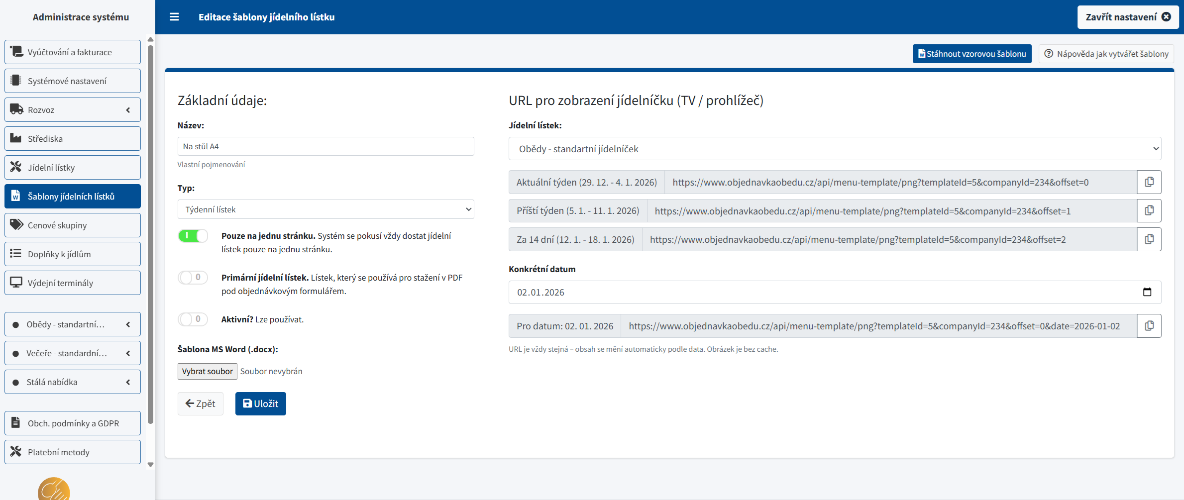 - Správa jídelníčků – export jídelníčku do PDF/DOCX/PNG (viz Správa jídelníčků).