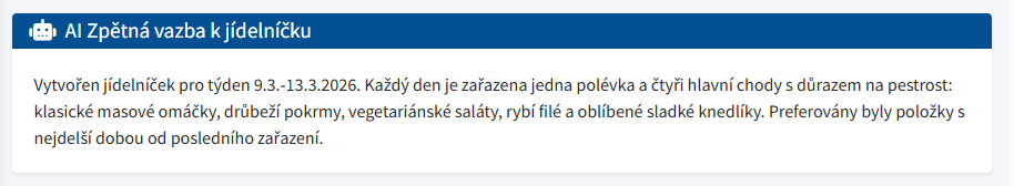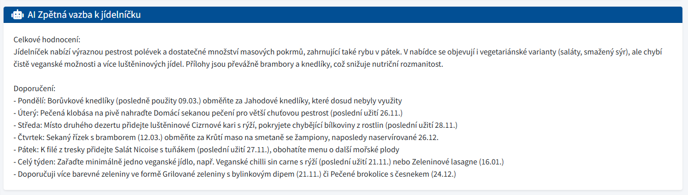 Výsledek se zobrazí v panelu „AI Zpětná vazba“. Slouží jako rychlá kontrola před publikací – doporučená zejména u větších jídelníčků nebo po importech.
