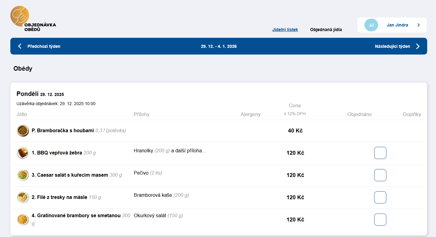 - Pro konzistentní názvy a alergeny používejte Definice jídel.