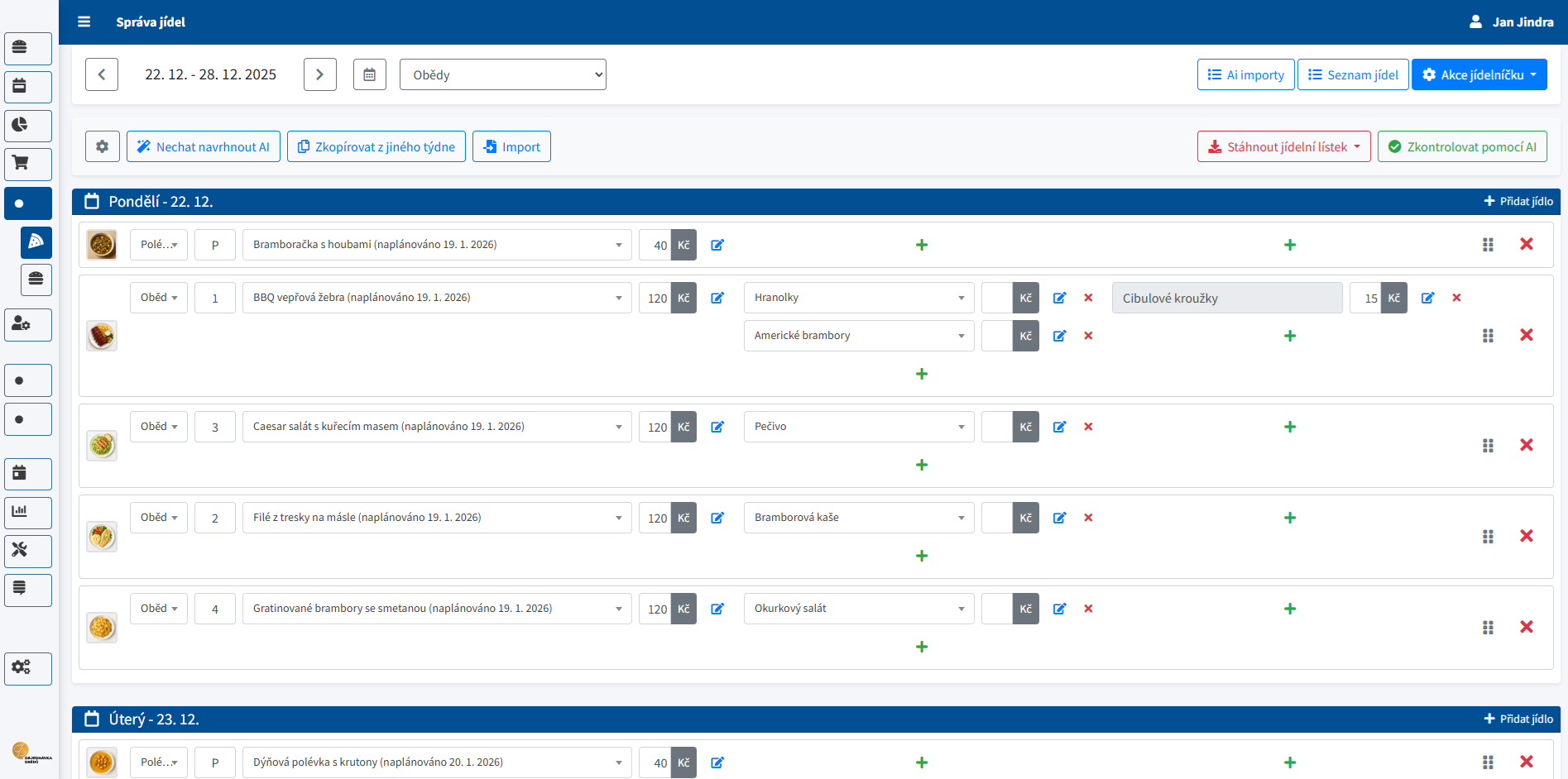 Editor pracuje po týdnech. V hlavní části vidíte jednotlivé dny a jejich jídla, které můžete přidávat, upravovat nebo mazat. Nástrojová lišta nahoře slouží pro hromadné akce (kopírování, importy, exporty, publikaci) a pro zapnutí doplňkových nástrojů, jako je AI návrh nebo AI kontrola.