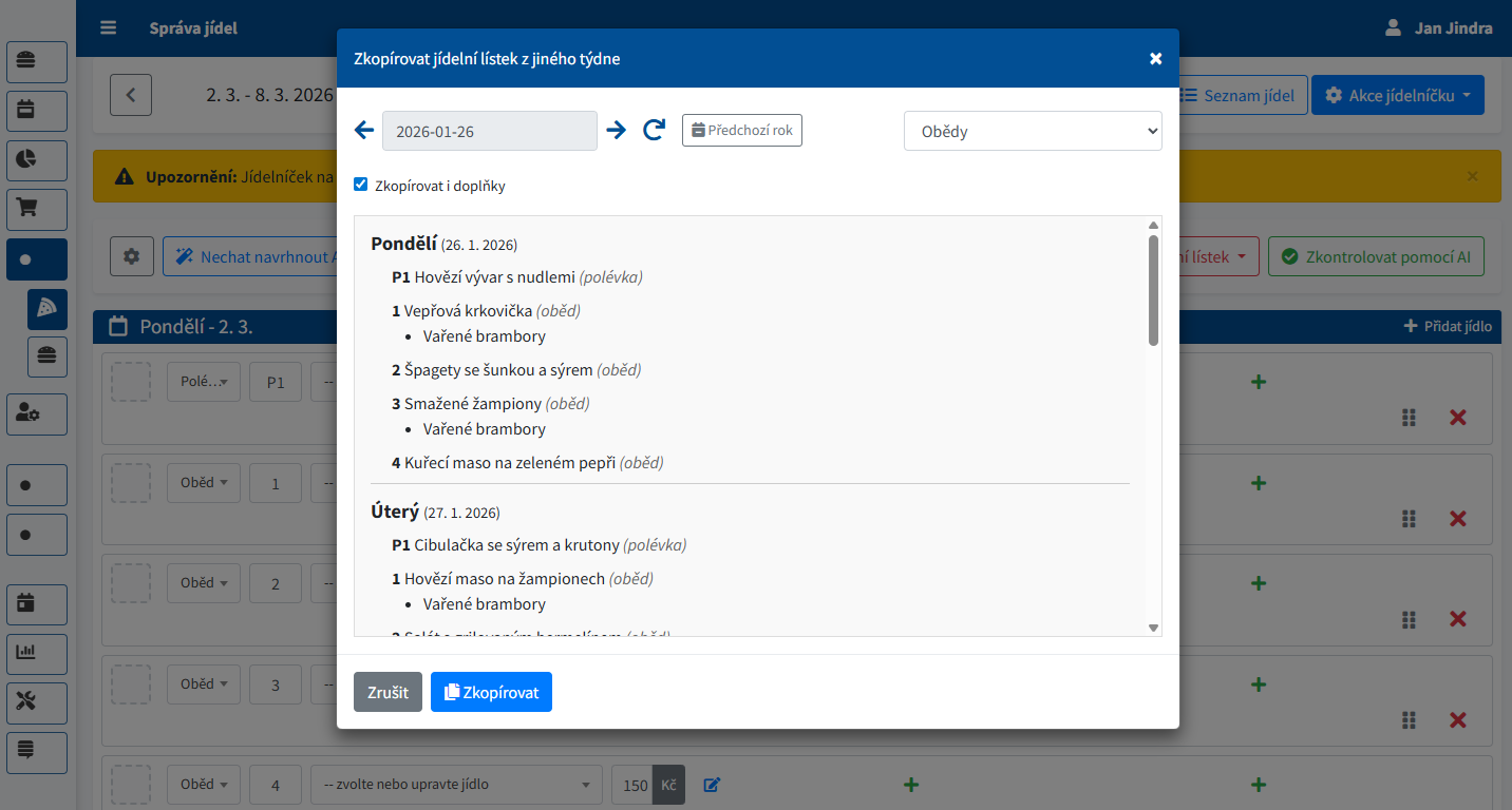 Po kliknutí na tlačítko Zkopírovat z jiného týdne se otevře modální okno, kde vyberete zdrojový týden nebo jiný jídelníček. Zde také určíte, zda se mají kopírovat i doplňky. Pokud cílový týden obsahuje objednávky, systém kopírování z bezpečnostních důvodů zablokuje.