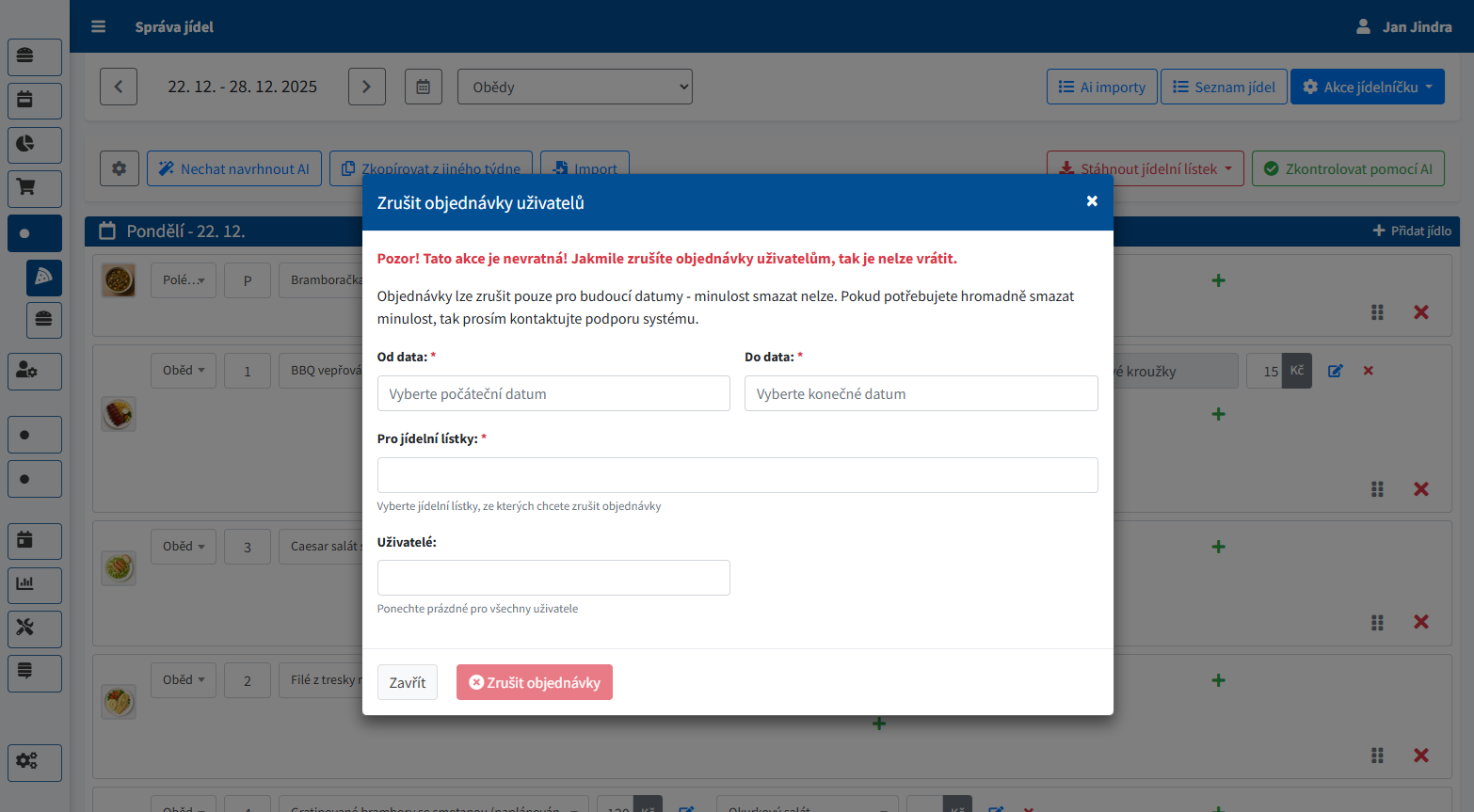 V modalním okně vyberete rozsah dat a jídelní lístky, kterých se zrušení týká. Volitelně můžete akci omezit jen na konkrétní uživatele, odběrná místa nebo školní třídy. Po potvrzení systém zruší všechny objednávky, které do filtru spadají.