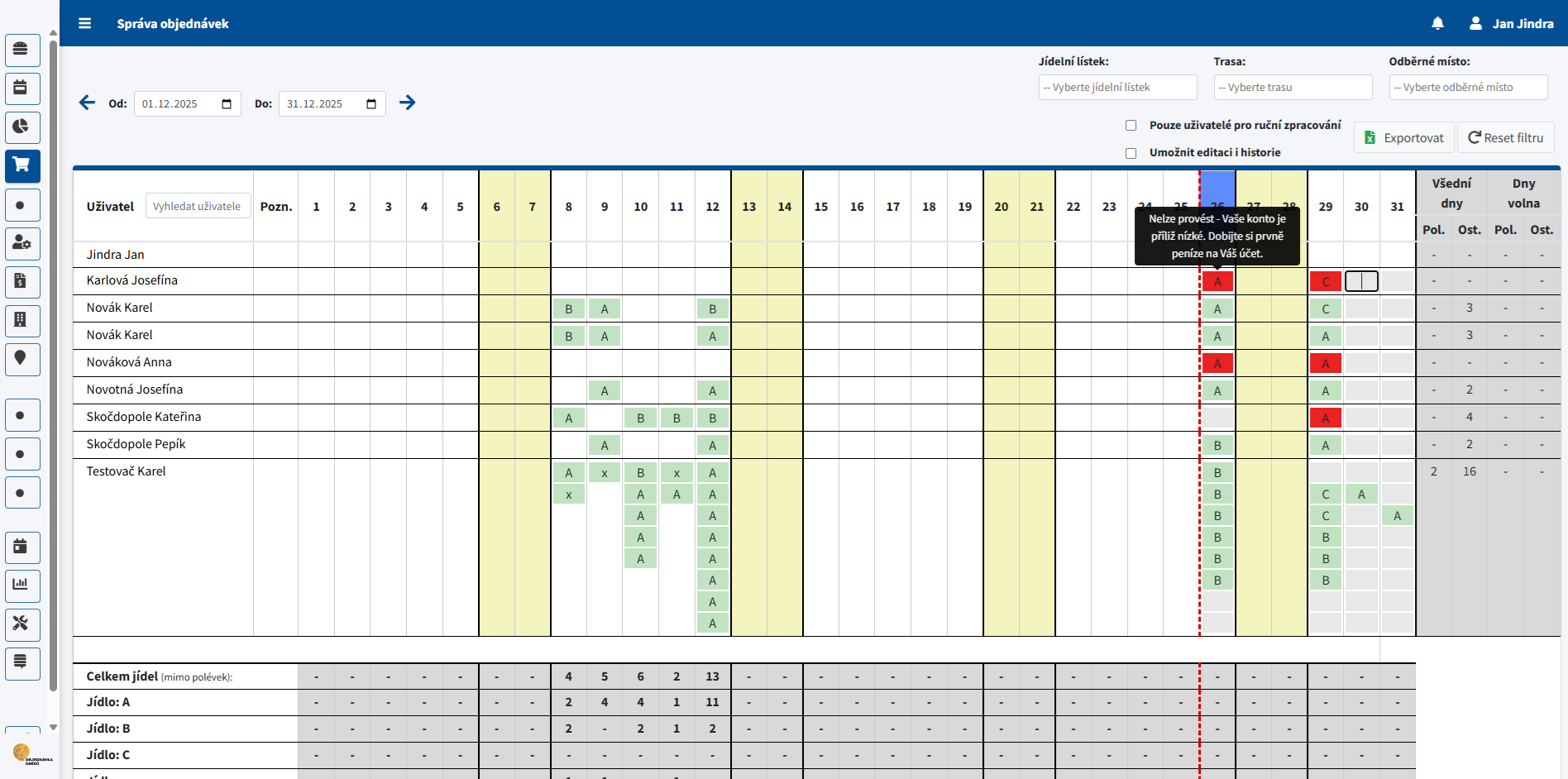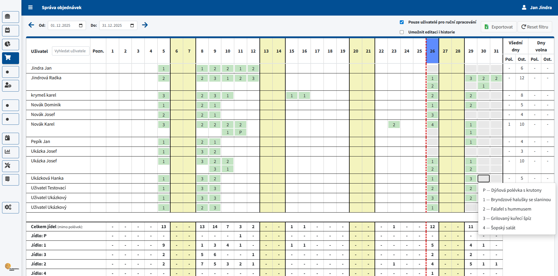 Správa objednávek slouží k ručnímu zadávání a hromadným úpravám objednávek napříč uživateli, dny a jídelními lístky. Typicky se používá tam, kde část zákazníků (například senioři) neobjednává sama přes web nebo mobilní aplikaci. Tabulka funguje podobně jako Excel, ale je optimalizovaná pro rychlé přepisování a kontrolu.
