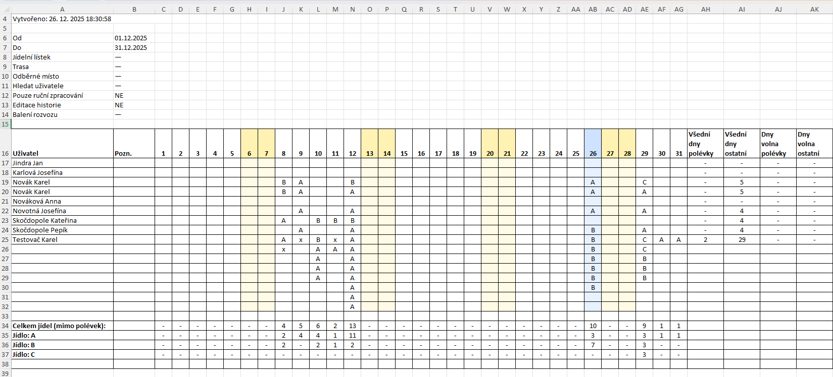 Na stránce je k dispozici export do Excelu. Export vždy respektuje aktuální filtr (období, jídelní lístky, trasy, odběrná místa, ruční režim).