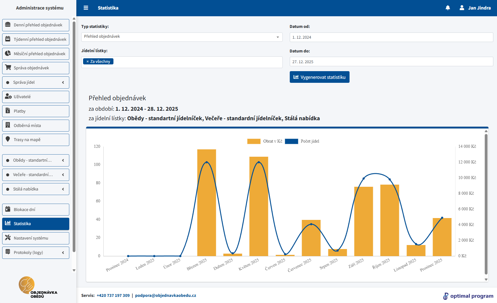 Statistika slouží pro rychlý přehled objednávek v čase. Standardně zobrazuje posledních 12 měsíců a umožňuje filtrovat data podle jídelních lístků.