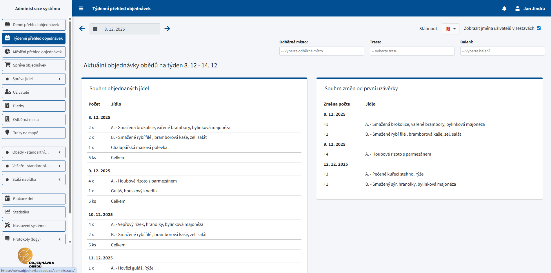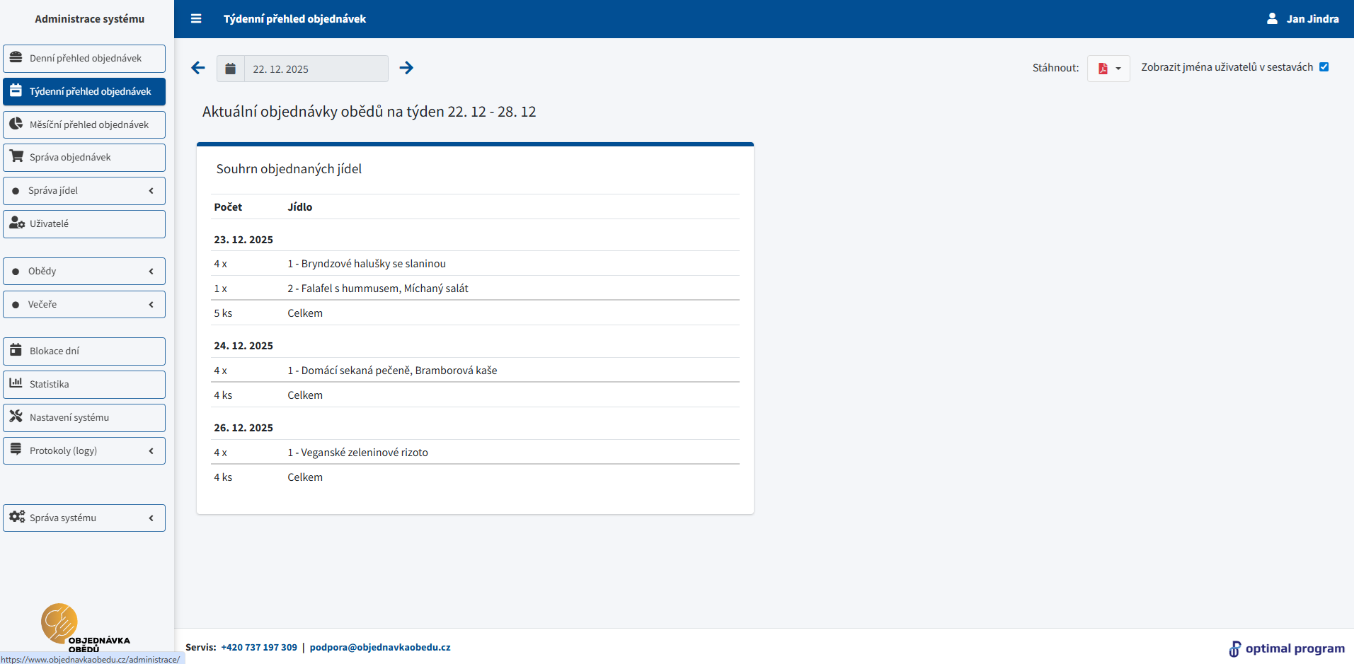 Pro zobrazení je potřeba oprávnění Týdenní přehled objednávek (viz Oprávnění administrátora).