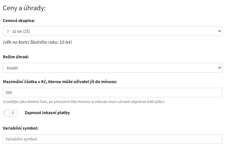 Tato část se v uživatelském formuláři zobrazí, pokud je zapnutý modul Platby nebo pokud jsou povolené Cenové skupiny. Některé volby se zobrazují jen v konkrétních režimech úhrad a při zapnutém inkasu.