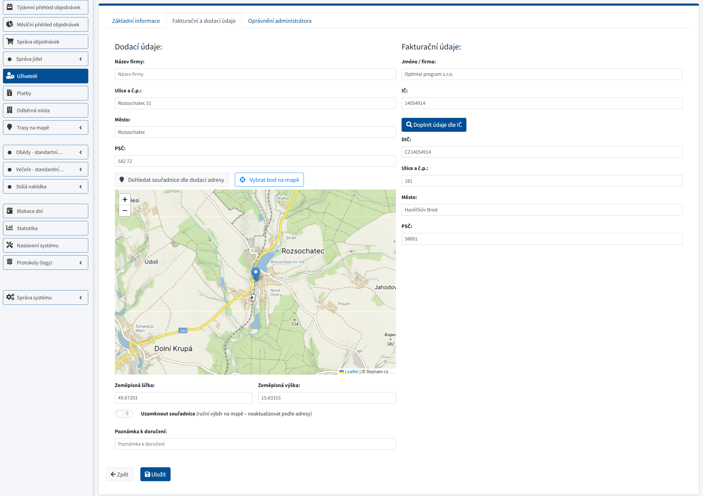 Dodací údaje slouží pro rozvoz a logistiku v modulu Dodavatel jídla. V rozvozových přehledech a exportech (např. Rozvoz) se adresa používá jako hlavní místo doručení a promítá se do plánování tras.