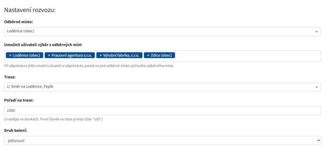 Nastavení rozvozu je přímo ve formuláři uživatele (Uživatelé → Nový/Editace uživatele).