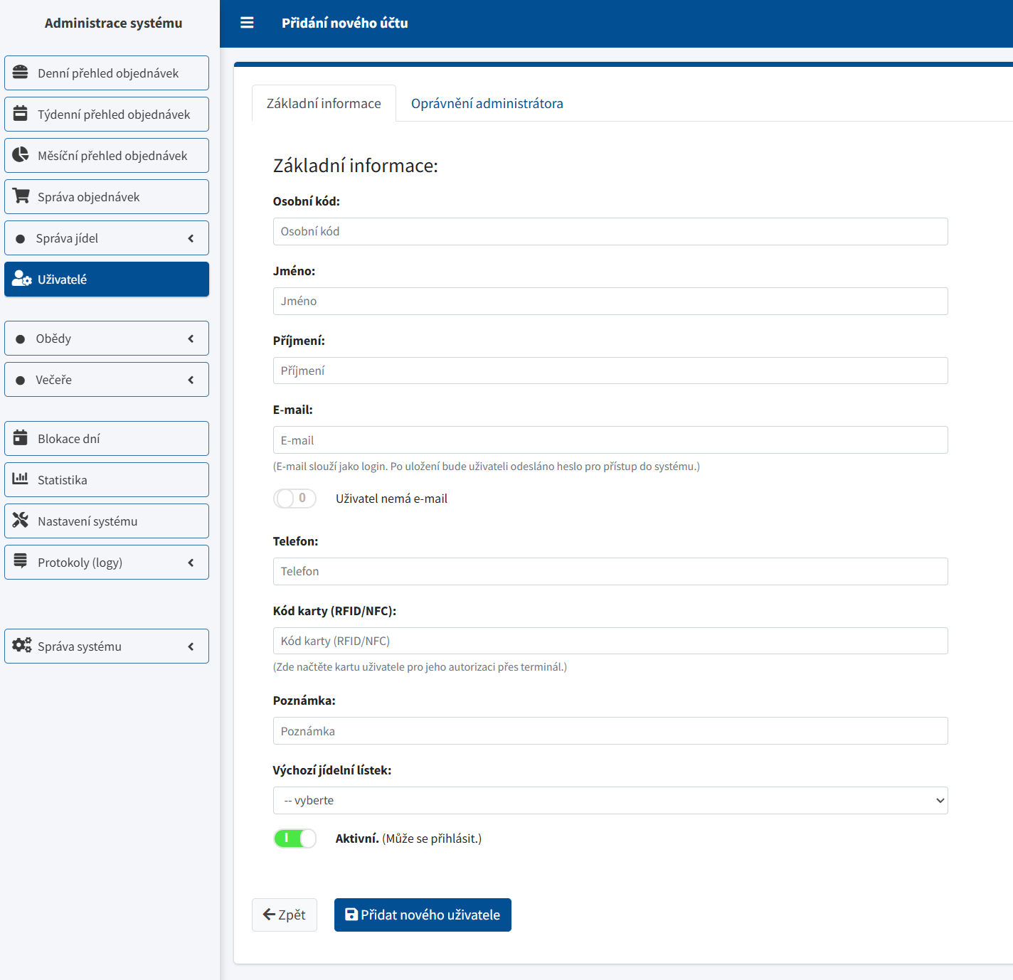 - Účet pouze pro výdej jídla - (pouze terminály) účet slouží jen pro výdej; uživatel nemůže objednávat.