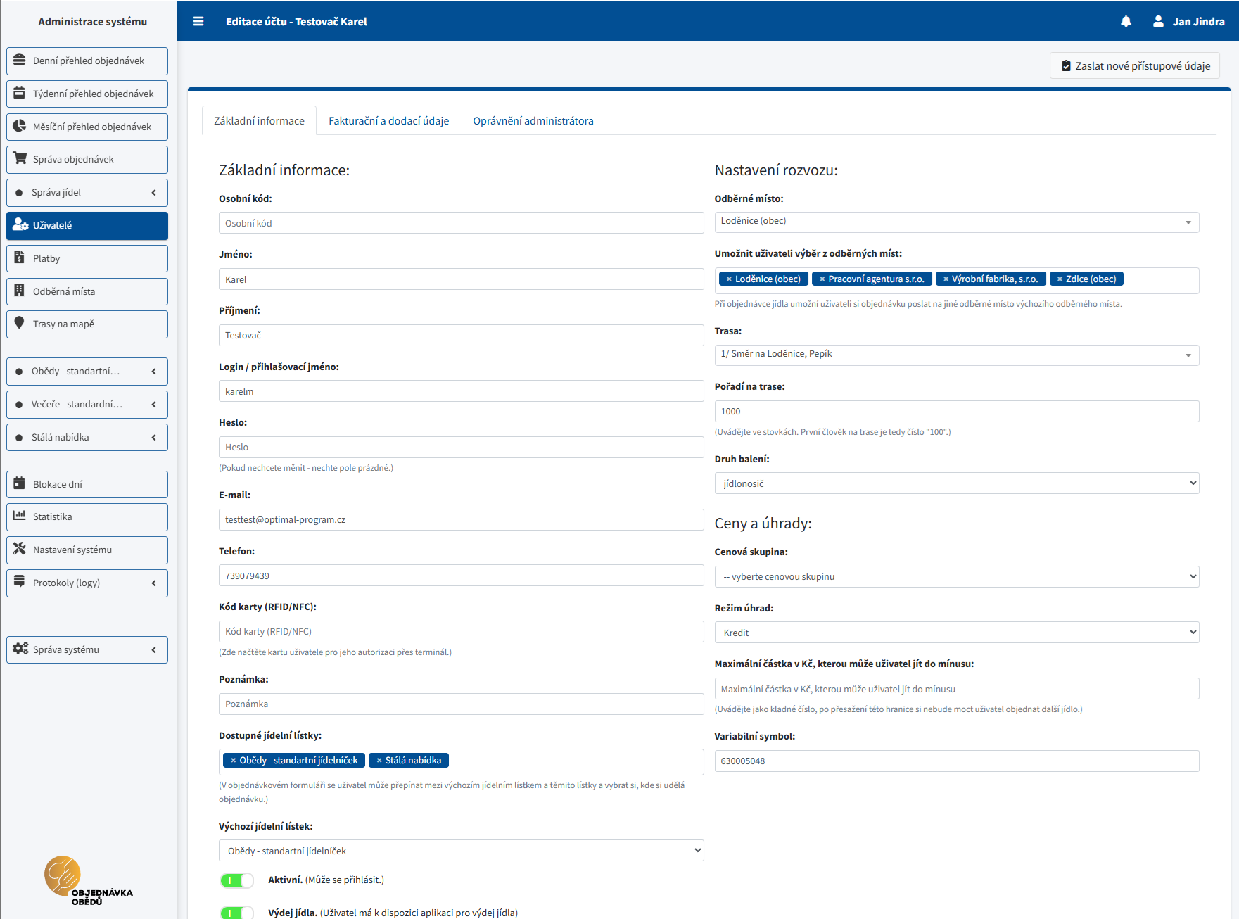 Telefon je dobrovolný údaj, ale doporučuje se vyplnit alespoň u administrátorů a u uživatelů v rozvozových režimech. V seznamových výstupech pro rozvoz slouží řidičům jako kontakt na zákazníka.