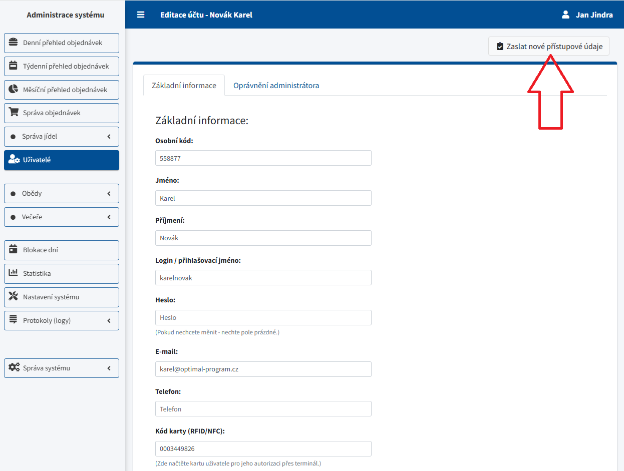 Vpravo nahoře v detailu uživatele je tlačítko Zaslat nové přístupové údaje. Zobrazuje se pouze u existujících účtů s vyplněným e-mailem a po kliknutí odešle nové přihlašovací údaje.
