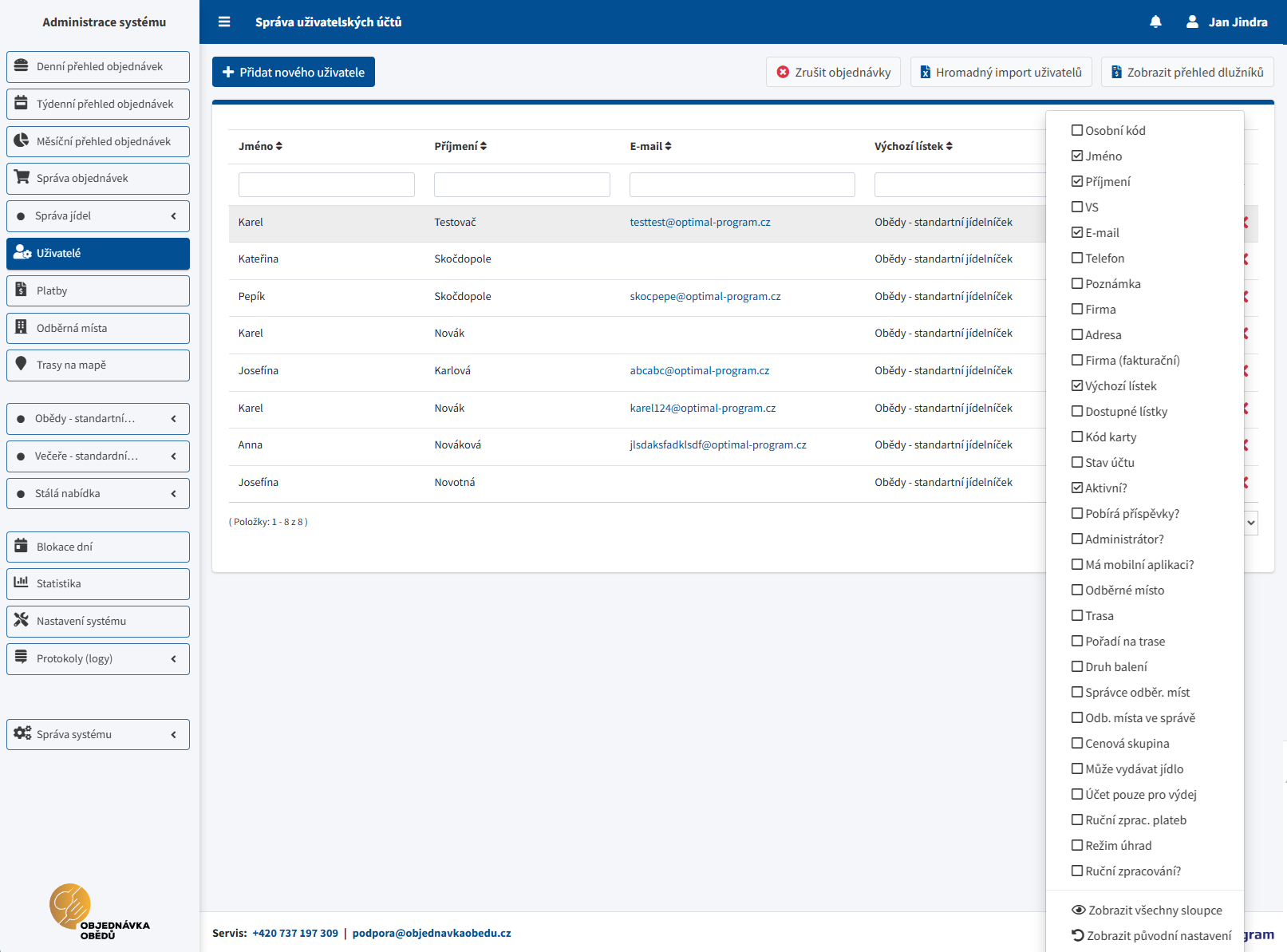Sloupce lze skrývat a zobrazovat. Systém si tento stav ukládá k vašemu účtu administrátora, takže se při dalším otevření použije stejné nastavení. Každý uživatel si tak může tabulku přizpůsobit podle sebe. V nabídce sloupců lze obnovit výchozí stav.