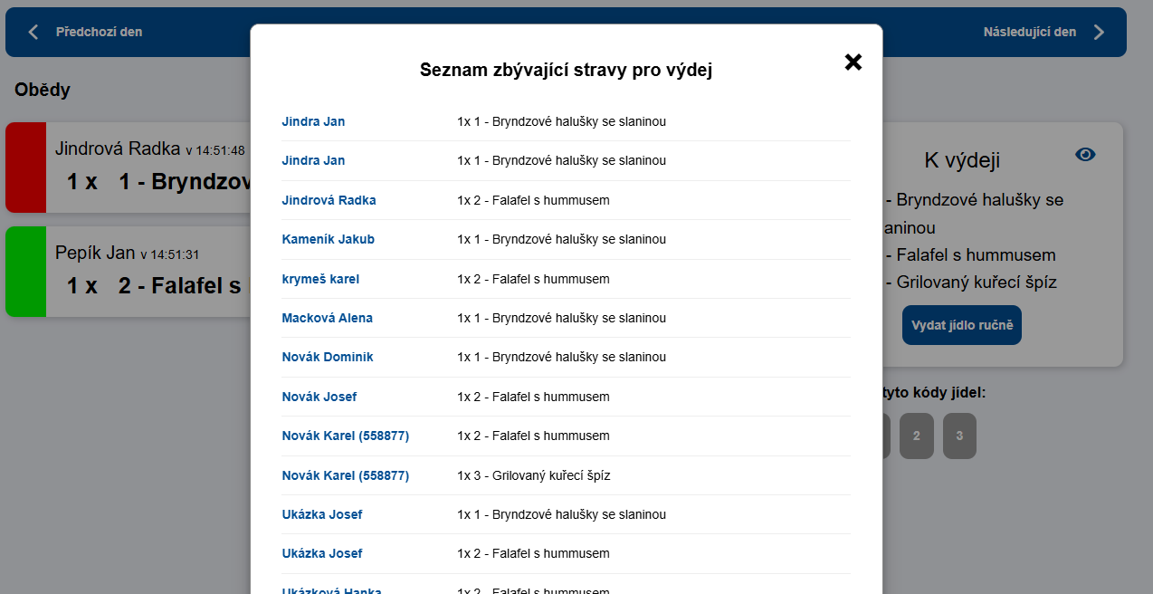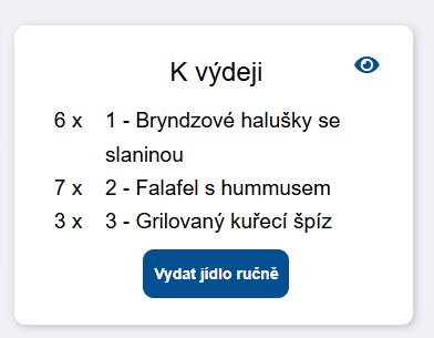 Vpravo se zobrazuje blok K výdeji se souhrnem zbývajících jídel. Ikona „očíčka“ otevře seznam lidí a jejich nevydaných jídel – z tohoto seznamu lze vydat jídlo kliknutím na jméno. Obsluha tak rychle vidí, co ještě zbývá a komu to má vydat.