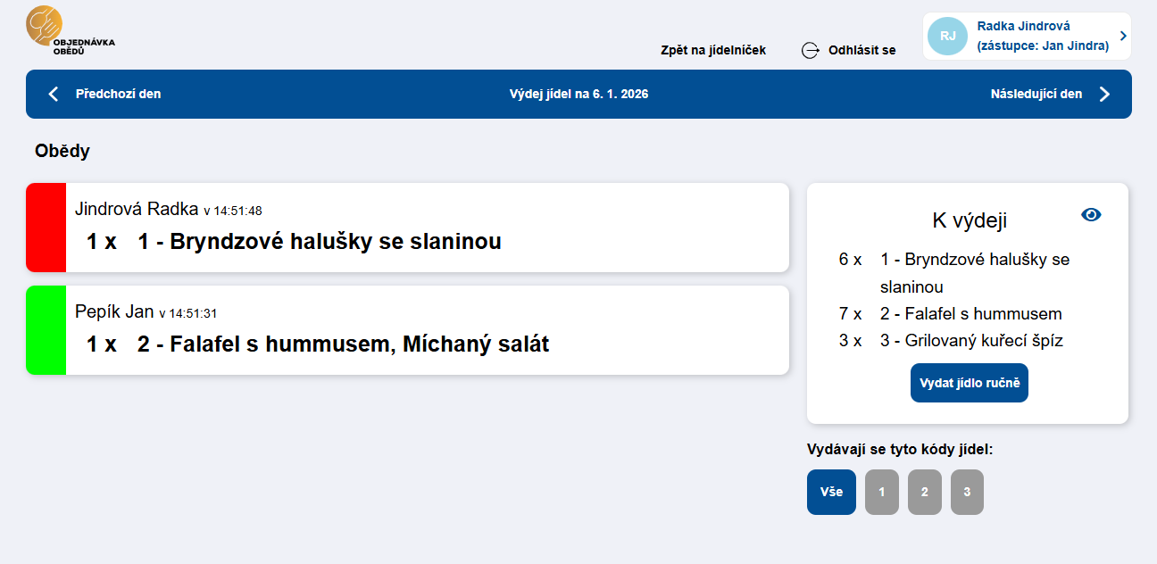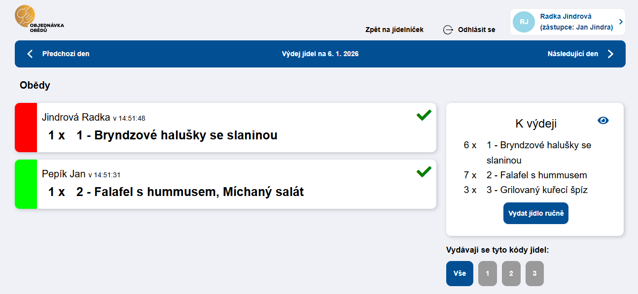 V základu se vždy zobrazí dnešek a vydávat jídla lze pouze dnes. Ostatní dny jsou pouze informativní a nelze v nich provádět změny ani výdej. Slouží třeba k přípravě na další den (např. kontrola počtů, příprava ešusů) nebo ke zpětnému přehledu, kdo si jídlo nevyzvedl.