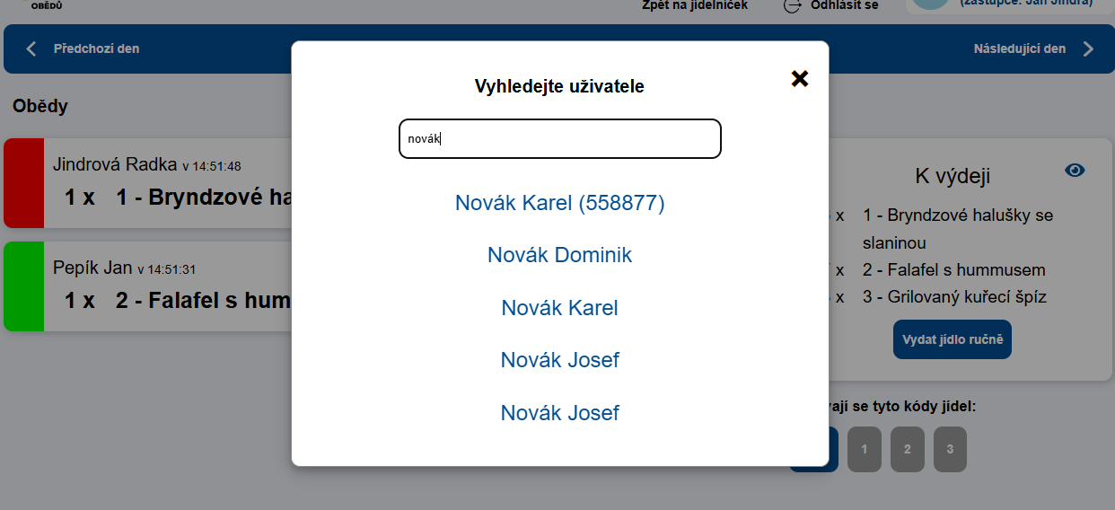 Pokud uživatel nemá kartu/čip nebo ho terminál nenačte, lze použít tlačítko Vydat jídlo ručně. Otevře se vyhledávání, kde stačí začít psát jméno – systém uživatele najde a obsluha mu jídlo vydá kliknutím. U menších provozů lze vydávat i přes „očíčko“, kde uživatele snadno najdete v seznamu.